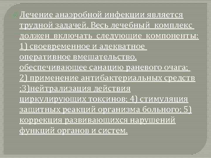 Лечение анаэробной инфекции является трудной задачей. Весь лечебный комплекс должен включать следующие компоненты: 1) своевременное и адекватное оперативное вмешательство, обеспечивающее санацию раневого очага; 2) применение антибактериальных средств ; 3)нейтрализация действия циркулирующих токсинов; 4) стимуляция защитных реакций организма больного; 5) коррекция развивающихся нарушений функций органов и систем.