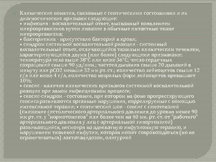 Клинические понятия, связанные с септическими состояниями и их диагностические признаки следующие: • инфекция - воспалительный ответ, вызванный появлением микроорганизмов путем инвазии в обычные интактные ткани микроорганизма; • бактериемия - присутствие бактерий в крови; • синдром системной воспалительной реакции - системный воспалительный ответ, отличающийся тяжелым клиническим течением, характеризующийся двумя (или более) следующими признаками: температура тела выше 38°С или ниже 36°С; число сердечных сокращений свыше 90 уд/мин. ; частота дыхания свыше 20 дыханий в минуту или р. СО 2 меньше 32 мм рт. ст. ; количество лейкоцитов свыше 12 г/л или ниже 4 г/л, количество незрелых форм лейкоцитов превышает 10%; • сепсис - наличие клинических признаков системной воспалительной реакции при явном инфекционном процессе; • сепсис-синдром - состояние, при котором на фоне прогрессирующего сепсиса развиваются органные нарушения, коррелируемые с помощью интенсивной терапии; • септический шок - сепсис с гипотензией (снижение систолического артериального давления до уровня менее 90 мм рт. ст. у "нормотоников" или более чем на 40 мм. рт. ст. от "рабочего" артериального давления у лиц с артериальной гипертензией) развивающийся, несмотря на адекватную инфузионную терапию, и нарушением тканевой инфузии, которая может сопровождаться (но не ограничиваться) лактатацидозом, олигурией