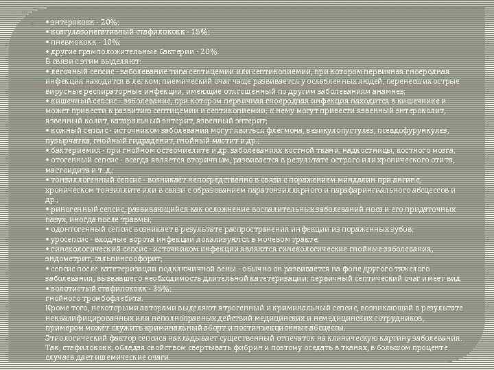 • энтерококк - 20%; • коагулазонегативный стафилококк - 15%; • пневмококк - 10%; • другие грамположительные бактерии - 20%. В связи с этим выделяют: • легочный сепсис - заболевание типа септицемии или септикопиемии, при котором первичная гноеродная инфекция находится в легком; пиемический очаг чаще развивается у ослабленных людей, перенесших острые вирусные респираторные инфекции, имеющие отягощенный по другим заболеваниям анамнез; • кишечный сепсис - заболевание, при котором первичная гноеродная инфекция находится в кишечнике и может привести к развитию септицемии и септикопиемии; к нему могут привести язвенный энтероколит, язвенный колит, катаральный энтерит, язвенный энтерит; • кожный сепсис - источником заболевания могут явиться флегмона, везикулопустулез, псевдофурункулез, пузырчатка, гнойный гидраденит, гнойный мастит и др. ; • бактериемия - при гнойном остеомиелите и др. заболеваниях костной ткани, надкостницы, костного мозга; • отогенный сепсис - всегда является вторичным, развивается в результате острого или хронического отита, мастоидита и т. д. ; • тонзиллогенный сепсис - возникает непосредственно в связи с поражением миндалин при ангине, хроническом тонзиллите или в связи с образованием паратонзиллярного и парафарингиального абсцессов и др. ; • риногенный сепсис, развивающийся как осложнение воспалительных заболеваний носа и его придаточных пазух, иногда после травмы; • одонтогенный сепсис возникает в результате распространения инфекции из пораженных зубов; • уросепсис - входные ворота инфекции локализуются в мочевом тракте; • гинекологический сепсис - источником инфекции являются гинекологические гнойные заболевания, эндометрит, сальпингоофорит; • сепсис после катетеризации подключичной вены - обычно он развивается на фоне другого тяжелого заболевания, вызвавшего необходимость длительной катетеризации; первичный септический очаг имеет вид • золотистый стафилококк - 35%; гнойного тромбофлебита. Кроме того, некоторыми авторами выделяют ятрогенный и криминальный сепсис, возникающий в результате неквалифицированных или неполноправных действий медицинских и немедицинских сотрудников, примером может служить криминальный аборт и постинъекционные абсцессы. Этиологический фактор сепсиса накладывает существенный отпечаток на клиническую картину заболевания. Так, стафилококк, обладая свойством свертывать фибрин и поэтому оседать в тканях, в большом проценте случаев дает ишемические очаги.
