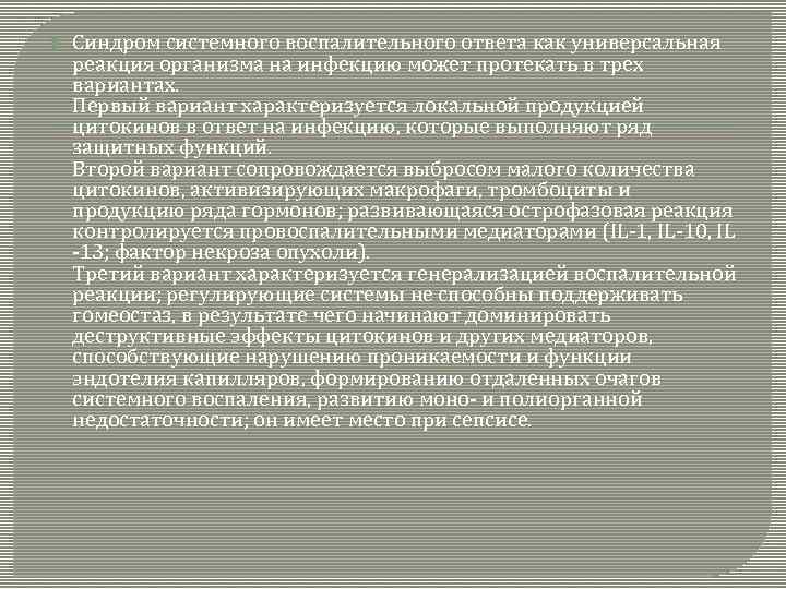 Синдром системного воспалительного ответа как универсальная реакция организма на инфекцию может протекать в трех вариантах. Первый вариант характеризуется локальной продукцией цитокинов в ответ на инфекцию, которые выполняют ряд защитных функций. Второй вариант сопровождается выбросом малого количества цитокинов, активизирующих макрофаги, тромбоциты и продукцию ряда гормонов; развивающаяся острофазовая реакция контролируется провоспалительными медиаторами (IL-1, IL-10, IL -13; фактор некроза опухоли). Третий вариант характеризуется генерализацией воспалительной реакции; регулирующие системы не способны поддерживать гомеостаз, в результате чего начинают доминировать деструктивные эффекты цитокинов и других медиаторов, способствующие нарушению проникаемости и функции эндотелия капилляров, формированию отдаленных очагов системного воспаления, развитию моно- и полиорганной недостаточности; он имеет место при сепсисе.