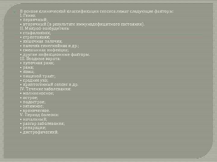 В основе клинической классификации сепсиса лежат следующие факторы: I. Генез: • первичный; • вторичный (в результате иммунодефицитного состояния). II. Микроб-возбудитель: • стафилококк; • стрептококк; • кишечная палочка; • палочка синегнойная и др. ; • смешанная инфекция; • другие инфекционные факторы. III. Входные ворота: • пупочная рана; • кожа; • пищевой тракт; • среднее ухо; • криптогенный сепсис и др. IV. Течение заболевания: • молниеносное; • острое; • подострое; • затяжное; • хроническое. V. Период болезни: • начальный; • разгар заболевания; • репарации; • дистрофический.