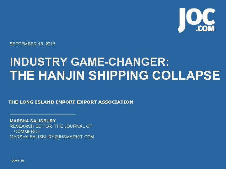 SEPTEMBER 15, 2016 INDUSTRY GAME-CHANGER: THE HANJIN SHIPPING COLLAPSE THE LONG ISLAND IMPORT EXPORT ASSOCIATION MARSHA SALISBURY RESEARCH EDITOR, THE JOURNAL OF COMMERCE MARSHA. SALISBURY@IHSMARKIT. COM © 2016 IHS