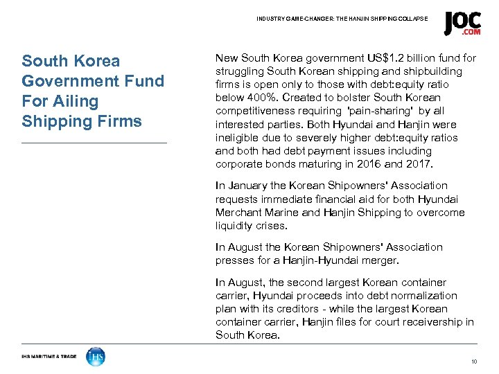INDUSTRY GAME-CHANGER: THE HANJIN SHIPPING COLLAPSE South Korea Government Fund For Ailing Shipping Firms New South Korea government US$1. 2 billion fund for struggling South Korean shipping and shipbuilding firms is open only to those with debt: equity ratio below 400%. Created to bolster South Korean competitiveness requiring 'pain-sharing' by all interested parties. Both Hyundai and Hanjin were ineligible due to severely higher debt: equity ratios and both had debt payment issues including corporate bonds maturing in 2016 and 2017. In January the Korean Shipowners' Association requests immediate financial aid for both Hyundai Merchant Marine and Hanjin Shipping to overcome liquidity crises. In August the Korean Shipowners' Association presses for a Hanjin-Hyundai merger. In August, the second largest Korean container carrier, Hyundai proceeds into debt normalization plan with its creditors - while the largest Korean container carrier, Hanjin files for court receivership in South Korea. 10