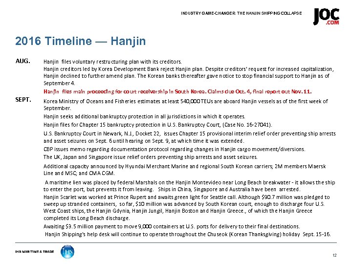 INDUSTRY GAME-CHANGER: THE HANJIN SHIPPING COLLAPSE 2016 Timeline — HYUNDAI MERCHANT MARINE Hyundai, the second largest Korean container carrier by TEU capacity, in voluntary MARCH restructuring agreement with creditors that include asset sales, debt adjustment with creditors and charter renegotiations. [Debt ratio was 5, 307% on March 31. ] Hyundai signs agreement with creditors to proceed into debt normalization plan. JULY Completes debt for equity swap for creditors after stakeholder 7: 1 capital reductions. New shares to shareholders, creditors, bondholders and shipowners in debt-load reduction. State-run Korea Development Bank becomes largest stakeholder. [Debt ratio now 200% - and newly eligible for gov't funding. ] Hyundai signs binding agreement with the 2 M vessel sharing agreement alliance of Maersk Line and MSC to commence in April 2017, remaining in the G 6 through March 2017. Subject to various final negotiations and regulatory approvals. SEPT. New Hyundai management team to be announced. FMC closed door staff briefing on 'Staff Briefing on the Maersk/MSC Vessel Sharing Agreement, FMC Agreement No. 012293‘ on Sept. 20. [Hyundai to join this 2 M VSA alliance in April 2017 subject to various regulatory approvals. ] www. fmc. gov/Meeting_920 -2016 11