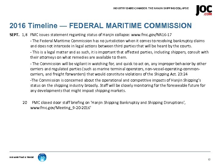 INDUSTRY GAME-CHANGER: THE HANJIN SHIPPING COLLAPSE 2016 Timeline — FEDERAL MARITIME COMMISSION SEPT. 1, 8 FMC issues statement regarding status of Hanjin collapse: www. fmc. gov/NR 16 -17 - The Federal Maritime Commission has no jurisdiction when it comes to resolving bankruptcy claims and does not intercede in legal actions between third parties that will be heard by the courts. - This is a legal matter and as such, it is important that affected parties, including shippers, consult with their attorneys on what remedies are available to them. - The Commission will be vigilant in watching for, and quick to act on, any improper behavior by other carriers and regulated parties (such as marine terminal operators, non-vessel-operating-commoncarriers, and freight forwarders) that would constitute violations of the Shipping Act. 23: 24 -The Commission is concerned about the operational and competitive impacts of Hanjin Shipping's status on the shipping industry broadly. Staff will be closely monitoring for the foreseeable future for any developments that might impact shipping markets. 20 FMC closed door staff briefing on 'Hanjin Shipping Bankruptcy and Shipping Disruptions', www. fmc. gov/Meeting_9 -20 -2016' 13