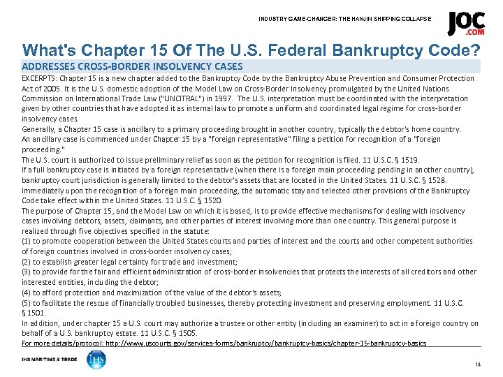 INDUSTRY GAME-CHANGER: THE HANJIN SHIPPING COLLAPSE What's Chapter 15 Of The U. S. Federal Bankruptcy Code? ADDRESSES CROSS-BORDER INSOLVENCY CASES EXCERPTS: Chapter 15 is a new chapter added to the Bankruptcy Code by the Bankruptcy Abuse Prevention and Consumer Protection Act of 2005. It is the U. S. domestic adoption of the Model Law on Cross-Border Insolvency promulgated by the United Nations Commission on International Trade Law ("UNCITRAL") in 1997. The U. S. interpretation must be coordinated with the interpretation given by other countries that have adopted it as internal law to promote a uniform and coordinated legal regime for cross-border insolvency cases. Generally, a Chapter 15 case is ancillary to a primary proceeding brought in another country, typically the debtor's home country. An ancillary case is commenced under Chapter 15 by a "foreign representative" filing a petition for recognition of a "foreign proceeding. " The U. S. court is authorized to issue preliminary relief as soon as the petition for recognition is filed. 11 U. S. C. § 1519. If a full bankruptcy case is initiated by a foreign representative (when there is a foreign main proceeding pending in another country), bankruptcy court jurisdiction is generally limited to the debtor's assets that are located in the United States. 11 U. S. C. § 1528. Immediately upon the recognition of a foreign main proceeding, the automatic stay and selected other provisions of the Bankruptcy Code take effect within the United States. 11 U. S. C. § 1520. The purpose of Chapter 15, and the Model Law on which it is based, is to provide effective mechanisms for dealing with insolvency cases involving debtors, assets, claimants, and other parties of interest involving more than one country. This general purpose is realized through five objectives specified in the statute: (1) to promote cooperation between the United States courts and parties of interest and the courts and other competent authorities of foreign countries involved in cross-border insolvency cases; (2) to establish greater legal certainty for trade and investment; (3) to provide for the fair and efficient administration of cross-border insolvencies that protects the interests of all creditors and other interested entities, including the debtor; (4) to afford protection and maximization of the value of the debtor's assets; (5) to facilitate the rescue of financially troubled businesses, thereby protecting investment and preserving employment. 11 U. S. C. § 1501. In addition, under chapter 15 a U. S. court may authorize a trustee or other entity (including an examiner) to act in a foreign country on behalf of a U. S. bankruptcy estate. 11 U. S. C. § 1505. For more details/protocol: http: //www. uscourts. gov/services-forms/bankruptcy-basics/chapter-15 -bankruptcy-basics 14