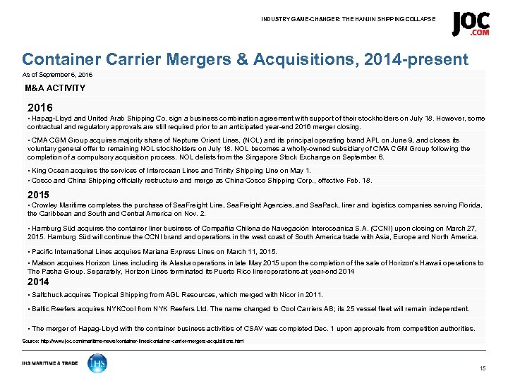INDUSTRY GAME-CHANGER: THE HANJIN SHIPPING COLLAPSE Container Carrier Mergers & Acquisitions, 2014 -present As of September 6, 2016 M&A ACTIVITY 2016 • Hapag-Lloyd and United Arab Shipping Co. sign a business combination agreement with support of their stockholders on July 18. However, some contractual and regulatory approvals are still required prior to an anticipated year-end 2016 merger closing. • CMA CGM Group acquires majority share of Neptune Orient Lines, (NOL) and its principal operating brand APL on June 9, and closes its voluntary general offer to remaining NOL stockholders on July 18. NOL becomes a wholly-owned subsidiary of CMA CGM Group following the completion of a compulsory acquisition process. NOL delists from the Singapore Stock Exchange on September 6. • King Ocean acquires the services of Interocean Lines and Trinity Shipping Line on May 1. • Cosco and China Shipping officially restructure and merge as China Cosco Shipping Corp. , effective Feb. 18. 2015 • Crowley Maritime completes the purchase of Sea. Freight Line, Sea. Freight Agencies, and Sea. Pack, liner and logistics companies serving Florida, the Caribbean and South and Central America on Nov. 2. • Hamburg Süd acquires the container liner business of Compañía Chilena de Navegación Interoceánica S. A. (CCNI) upon closing on March 27, 2015. Hamburg Süd will continue the CCNI brand operations in the west coast of South America trade with Asia, Europe and North America. • Pacific International Lines acquires Mariana Express Lines on March 11, 2015. • Matson acquires Horizon Lines including its Alaska operations in late May 2015 upon the completion of the sale of Horizon's Hawaii operations to The Pasha Group. Separately, Horizon Lines terminated its Puerto Rico liner operations at year-end 2014 • Saltchuck acquires Tropical Shipping from AGL Resources, which merged with Nicor in 2011. • Baltic Reefers acquires NYKCool from NYK Reefers Ltd. The name changed to Cool Carriers AB; its 25 vessel fleet will remain independent. • The merger of Hapag-Lloyd with the container business activities of CSAV was completed Dec. 1 upon approvals from competition authorities. Source: http: //www. joc. com/maritime-news/container-lines/container-carrier-mergers-acquisitions. html 15