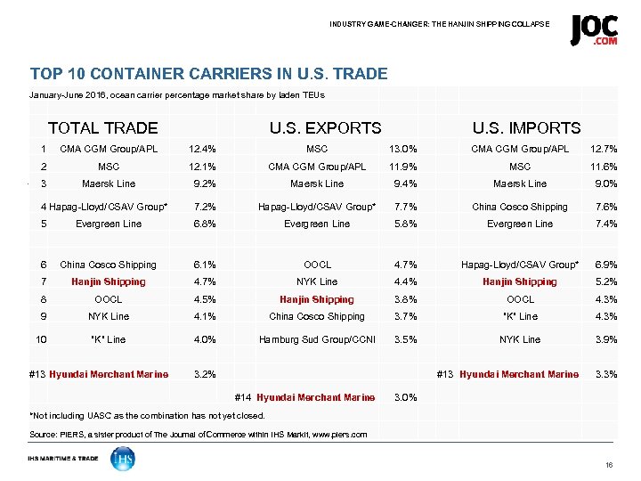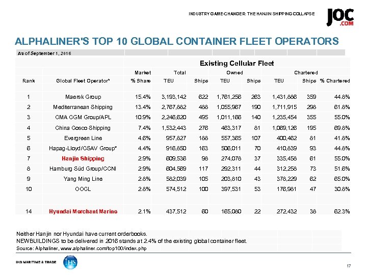 INDUSTRY GAME-CHANGER: THE HANJIN SHIPPING COLLAPSE TOP 10 CONTAINER CARRIERS IN U. S. TRADE January-June 2016, ocean carrier percentage market share by laden TEUs TOTAL TRADE U. S. EXPORTS U. S. IMPORTS 1 CMA CGM Group/APL 12. 4% MSC 13. 0% CMA CGM Group/APL 12. 7% 2 MSC 12. 1% CMA CGM Group/APL 11. 9% MSC 11. 6% 3 Maersk Line 9. 2% Maersk Line 9. 4% Maersk Line 9. 0% 4 Hapag-Lloyd/CSAV Group* 7. 2% Hapag-Lloyd/CSAV Group* 7. 7% China Cosco Shipping 7. 6% 5 Evergreen Line 6. 8% Evergreen Line 5. 8% Evergreen Line 7. 4% 6 China Cosco Shipping 6. 1% OOCL 4. 7% Hapag-Lloyd/CSAV Group* 6. 9% 7 Hanjin Shipping 4. 7% NYK Line 4. 4% Hanjin Shipping 5. 2% 8 OOCL 4. 5% Hanjin Shipping 3. 8% OOCL 4. 3% 9 NYK Line 4. 1% China Cosco Shipping 3. 7% "K" Line 4. 3% 10 "K" Line 4. 0% Hamburg Sud Group/CCNI 3. 5% NYK Line 3. 9% #13 Hyundai Merchant Marine 3. 2% #13 Hyundai Merchant Marine #14 Hyundai Merchant Marine 3. 3% 3. 0% *Not including UASC as the combination has not yet closed. Source: PIERS, a sister product of The Journal of Commerce within IHS Markit, www. piers. com 16