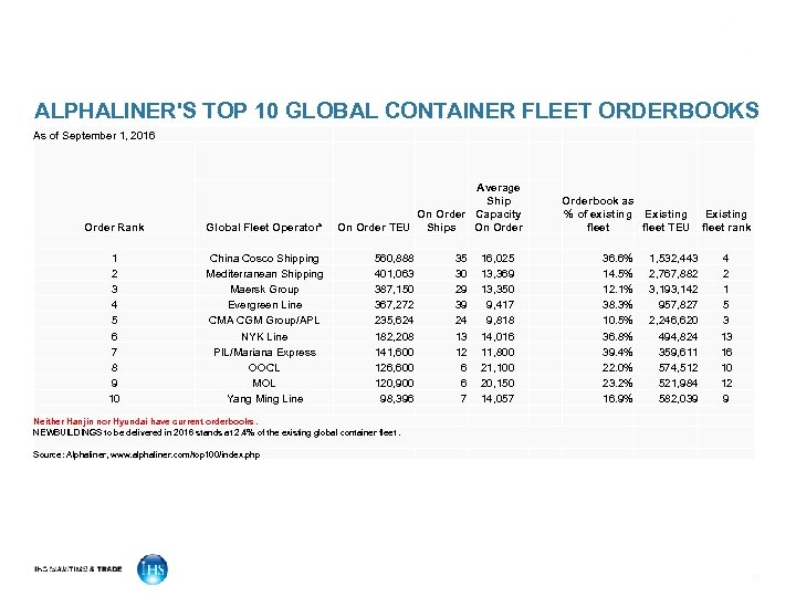 JOC TOP 100 U. S. IMPORTERS IN 2015 ALPHALINER'S TOP 10 GLOBAL CONTAINER FLEET ORDERBOOKS As of September 1, 2016 Order Rank Global Fleet Operator* 1 2 3 4 5 6 7 8 9 10 China Cosco Shipping Mediterranean Shipping Maersk Group Evergreen Line CMA CGM Group/APL NYK Line PIL/Mariana Express OOCL MOL Yang Ming Line Average Ship On Order Capacity On Order TEU Ships On Order 560, 888 401, 063 387, 150 367, 272 235, 624 182, 208 141, 600 126, 600 120, 900 98, 396 35 16, 025 30 13, 369 29 13, 350 39 9, 417 24 9, 818 13 14, 016 12 11, 800 6 21, 100 6 20, 150 7 14, 057 Orderbook as % of existing Existing fleet TEU fleet rank 36. 6% 14. 5% 12. 1% 38. 3% 10. 5% 36. 8% 39. 4% 22. 0% 23. 2% 16. 9% 1, 532, 443 2, 767, 882 3, 193, 142 957, 827 2, 246, 620 494, 824 359, 611 574, 512 521, 984 582, 039 4 2 1 5 3 13 16 10 12 9 Neither Hanjin nor Hyundai have current orderbooks. NEWBUILDINGS to be delivered in 2016 stands at 2. 4% of the existing global container fleet. Source: Alphaliner, www. alphaliner. com/top 100/index. php © 2016 IHS 18