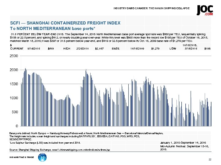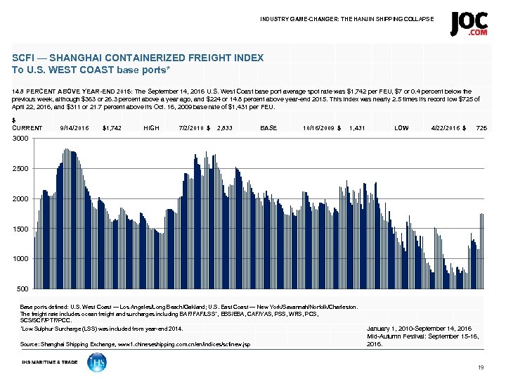 INDUSTRY GAME-CHANGER: THE HANJIN SHIPPING COLLAPSE SCFI — SHANGHAI CONTAINERIZED FREIGHT INDEX To NORTH EUROPE base ports* 21. 6 PERCENT BELOW YEAR-END 2015: The September 14, 2016 North Europe base port average spot rate was $966 per TEU, $23 or 2. 4 percent above the week before, and $510 or more than double from a year ago. While this level was more than four times above its record low $205 per TEU level of June 19, 2015, matched March 18, 2016; it was $266 or 21. 6 percent below both its year-end 2015 results, and its Oct. 16, 2009 base rate of $1, 232 per TEU. $ CURRENT 9/14/2016 $966 HIGH 3/5/2010 $2, 164 BASE 10/16/2009 $1, 232 LOW 6/19/2015, 3/18/2016 $205 Base ports defined: North Europe — Hamburg/Antwerp/Felixstowe/Le Havre; North Mediterranean Sea — Barcelona/Valencia/Genoa/Naples. The freight rate includes ocean freight and surcharges including BAF/FAF/LSS*, EBS/EBA, CAF/YAS, PSS, WRS, PCS, SCS/SCF/PTF/PCC. January 1, 2010 -September 14, 2016 *Low Sulphur Surcharge (LSS) was included from year-end 2014. Source: Shanghai Shipping Exchange, www 1. chineseshipping. com. cn/en/indices/scfinew. jsp Mid-Autumn Festival: September 15 -16, 2016. 21