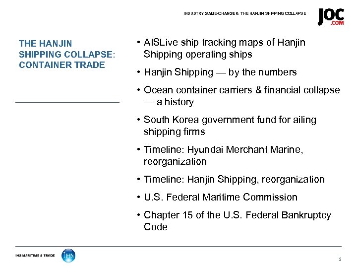 INDUSTRY GAME-CHANGER: THE HANJIN SHIPPING COLLAPSE THE HANJIN SHIPPING COLLAPSE: CONTAINER TRADE • AISLive ship tracking maps of Hanjin Shipping operating ships • Hanjin Shipping — by the numbers • Ocean container carriers & financial collapse — a history • South Korea government fund for ailing shipping firms • Timeline: Hyundai Merchant Marine, reorganization • Timeline: Hanjin Shipping, reorganization • U. S. Federal Maritime Commission • Chapter 15 of the U. S. Federal Bankruptcy Code 2