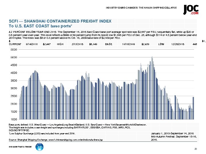 INDUSTRY GAME-CHANGER: THE HANJIN SHIPPING COLLAPSE SCFI — SHANGHAI CONTAINERIZED FREIGHT INDEX To U. S. WEST COAST base ports* 14. 8 PERCENT ABOVE YEAR-END 2015: The September 14, 2016 U. S. West Coast base port average spot rate was $1, 742 per FEU, $7 or 0. 4 percent below the previous week, although $363 or 26. 3 percent above a year ago, and $224 or 14. 8 percent above year-end 2015. This index was nearly 2. 5 times its record low $725 of April 22, 2016, and $311 or 21. 7 percent above its Oct. 16, 2009 base rate of $1, 431 per FEU. $ CURRENT 9/14/2016 $1, 742 HIGH 7/2/2010 $ 2, 833 BASE 10/16/2009 $ 1, 431 LOW 4/22/2016 $ 725 3000 2500 2000 1500 1000 500 Base ports defined: U. S. West Coast — Los Angeles/Long Beach/Oakland; U. S. East Coast — New York/Savannah/Norfolk/Charleston. The freight rate includes ocean freight and surcharges including BAF/FAF/LSS*, EBS/EBA, CAF/YAS, PSS, WRS, PCS, SCS/SCF/PTF/PCC. *Low Sulphur Surcharge (LSS) was included from year-end 2014. Source: Shanghai Shipping Exchange, www 1. chineseshipping. com. cn/en/indices/scfinew. jsp January 1, 2010 -September 14, 2016 Mid-Autumn Festival: September 15 -16, 2016. 19