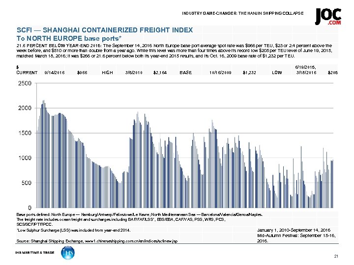 INDUSTRY GAME-CHANGER: THE HANJIN SHIPPING COLLAPSE SCFI — SHANGHAI CONTAINERIZED FREIGHT INDEX To U. S. EAST COAST base ports* 4. 2 PERCENT BELOW YEAR-END 2015: The September 14, 2016 East Coast base port average spot rate was $2, 447 per FEU, sequentially flat, while up $20 or 0. 8 percent year-over-year. This level reflects a $999 or 69 percent jump from its record low $1, 448 per FEU of Dec. 25, although $114 or 4. 5 percent below year-end 2015 spike. The index was $8 or 0. 3 percent above its Oct. 16, 2009 base rate of $2, 439 per FEU. $ $1, CURRENT 9/14/2016 $2, 447 HIGH 2/13/2015 $5, 049 BASE 10/16/2009 $2, 439 LOW 12/25/2015 448 Base ports defined: U. S. West Coast — Los Angeles/Long Beach/Oakland; U. S. East Coast — New York/Savannah/Norfolk/Charleston. The freight rate includes ocean freight and surcharges including BAF/FAF/LSS*, EBS/EBA, CAF/YAS, PSS, WRS, PCS, SCS/SCF/PTF/PCC. *Low Sulphur Surcharge (LSS) was included from year-end 2014. Source: Shanghai Shipping Exchange, www 1. chineseshipping. com. cn/en/indices/scfinew. jsp January 1, 2010 -September 14, 2016 Mid-Autumn Festival: September 15 -16, 2016. 20