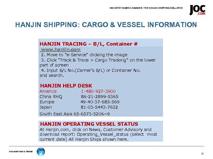 INDUSTRY GAME-CHANGER: THE HANJIN SHIPPING COLLAPSE HANJIN SHIPPING: CARGO & VESSEL INFORMATION HANJIN TRACING – B/L, Container # www. hanjin. com 2. Move to "e-Service" clicking the image 3. Click "Track & Trace > Cargo Tracking" on the lower part of screen 4. Input B/L No. (Carrier's B/L) or Container No. and search. HANJIN HELP DESK America 1 -480 -927 -3600 China RHQ 86 -21 -2899 -5365 Europe 49 -40 -37 -685 -569 Japan 81 -03 -5443 -7632 South East Asia 65 -6573 -5206~9 HANJIN OPERATING VESSEL STATUS At Hanjin. com, click on News, Customer Advisory and download report: Operating_Vessel_status (select most current date) All Hanjin Ships shown here. 23