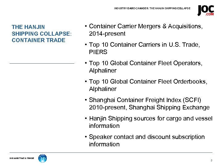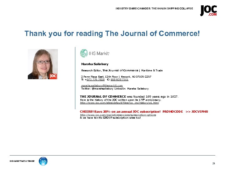 INDUSTRY GAME-CHANGER: THE HANJIN SHIPPING COLLAPSE Thank you for reading The Journal of Commerce! Marsha Salisbury Research Editor, The Journal of Commerce | Maritime & Trade 2 Penn Plaza East, 12 th Floor | Newark, NJ 07105 -2257 T: +973 776 7828 C: 908 608 7501 marsha. salisbury@ihsmarkit. com Twitter: @marshsalisbury Linked. In: Marsha Salisbury THE JOURNAL OF COMMERCE was founded 189 years ago in 1827. Here is the history of the JOC written upon its 175 th anniversary. http: //www. joc. com/sites/default/files/joc_inc/history/p 1. html CHEERS! Save 20% on an annual JOC subscription! PROMOCODE >> JOCVIPMS http: //www. joc. com/marketingservices/subscription-options & we have terrific GROUP subscription rates too! 24