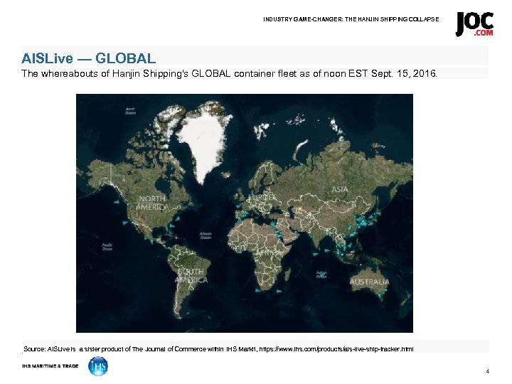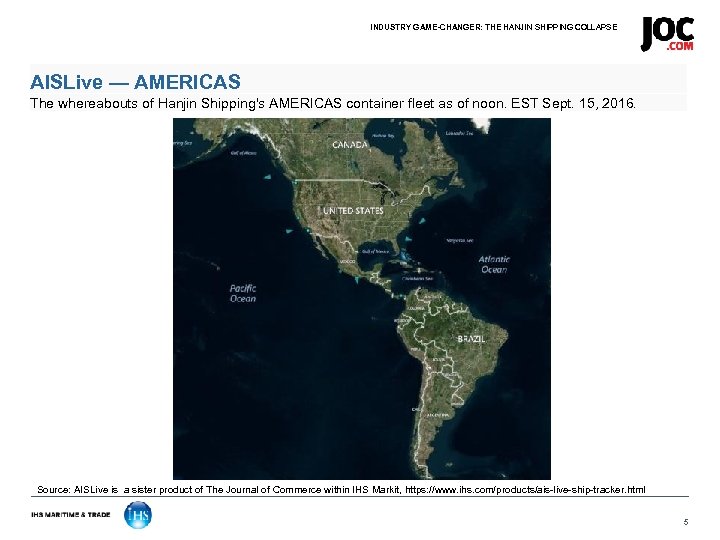 INDUSTRY GAME-CHANGER: THE HANJIN SHIPPING COLLAPSE AISLive — GLOBAL The whereabouts of Hanjin Shipping's GLOBAL container fleet as of noon EST Sept. 15, 2016. Source: AISLive is a sister product of The Journal of Commerce within IHS Markit, https: //www. ihs. com/products/ais-live-ship-tracker. html 4