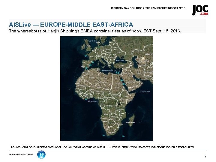 INDUSTRY GAME-CHANGER: THE HANJIN SHIPPING COLLAPSE AISLive — AMERICAS The whereabouts of Hanjin Shipping's AMERICAS container fleet as of noon. EST Sept. 15, 2016. Source: AISLive is a sister product of The Journal of Commerce within IHS Markit, https: //www. ihs. com/products/ais-live-ship-tracker. html 5