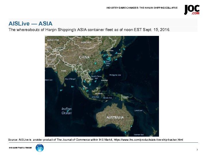 INDUSTRY GAME-CHANGER: THE HANJIN SHIPPING COLLAPSE AISLive — EUROPE-MIDDLE EAST-AFRICA The whereabouts of Hanjin Shipping's EMEA container fleet as of noon. EST Sept. 15, 2016. Source: AISLive is a sister product of The Journal of Commerce within IHS Markit, https: //www. ihs. com/products/ais-live-ship-tracker. html 6