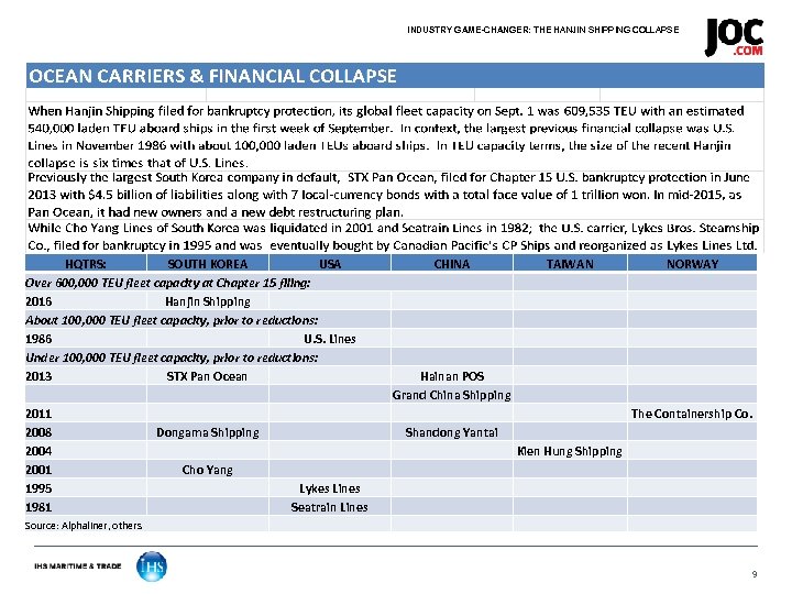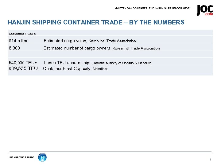 INDUSTRY GAME-CHANGER: THE HANJIN SHIPPING COLLAPSE HANJIN SHIPPING CONTAINER TRADE – BY THE NUMBERS September 1, 2016: $14 billion Estimated cargo value, Korea Int’l Trade Association 8, 300 Estimated number of cargo owners, Korea Int’l Trade Association 540, 000 TEU+ Laden TEU aboard ships, Korean Ministry of Oceans & Fisheries 609, 535 TEU Container Fleet Capacity, Alphaliner 8