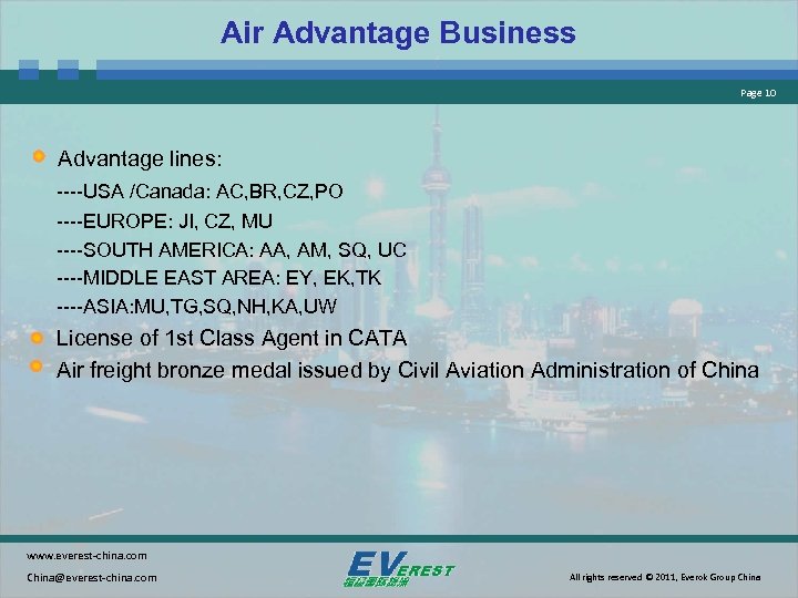 Air Advantage Business Page 10 Advantage lines: ----USA /Canada: AC, BR, CZ, PO ----EUROPE: JI, CZ, MU ----SOUTH AMERICA: AA, AM, SQ, UC ----MIDDLE EAST AREA: EY, EK, TK ----ASIA: MU, TG, SQ, NH, KA, UW License of 1 st Class Agent in CATA Air freight bronze medal issued by Civil Aviation Administration of China www. everest-china. com China@everest-china. com All rights reserved © 2011, Everok Group China
