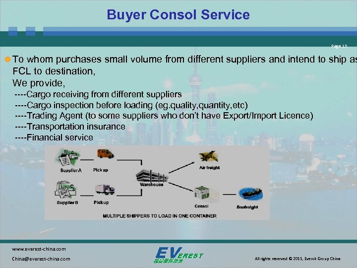 Special Services Page 12 Buyer Consol Service LDP(Landed Duty Paid) service(especially for garment) Heavy Lift, Oversized, Project Cargo Promotion in Canton Fair (every April and October) Warehousing Service Excellent IT System www. everest-china. com China@everest-china. com All rights reserved © 2011, Everok Group China