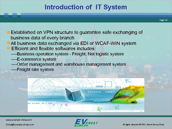 Introduction of IT System Page 19 Established on VPN structure to guarantee safe exchanging of business data of every branch All business data exchanged via EDI or WCAF-WIN system Efficient and flexible softwares includes: ----Business operation system - Freight. Net logistic system ----E-commerce system ----Order management and warehouse management system ----Freight rate system www. everest-china. com China@everest-china. com All rights reserved © 2011, Everok Group China
