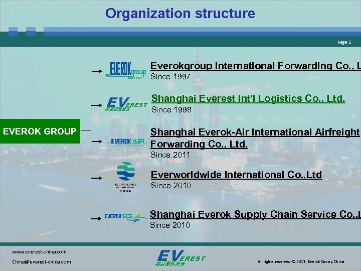 Organization structure Page 2 Everokgroup International Forwarding Co. , L Since 1997 Shanghai Everest Int'l Logistics Co. , Ltd. Since 1998 EVEROK GROUP Shanghai Everok-Air International Airfreight Forwarding Co. , Ltd. Since 2011 Everworldwide International Co. , Ltd Since 2010 Shanghai Everok Supply Chain Service Co. , L Since 2010 www. everest-china. com China@everest-china. com All rights reserved © 2011, Everok Group China