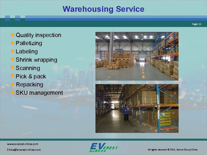 Warehousing Service Page 22 Quality inspection Palletizing Labeling Shrink wrapping Scanning Pick & pack Repacking SKU management www. everest-china. com China@everest-china. com All rights reserved © 2011, Everok Group China