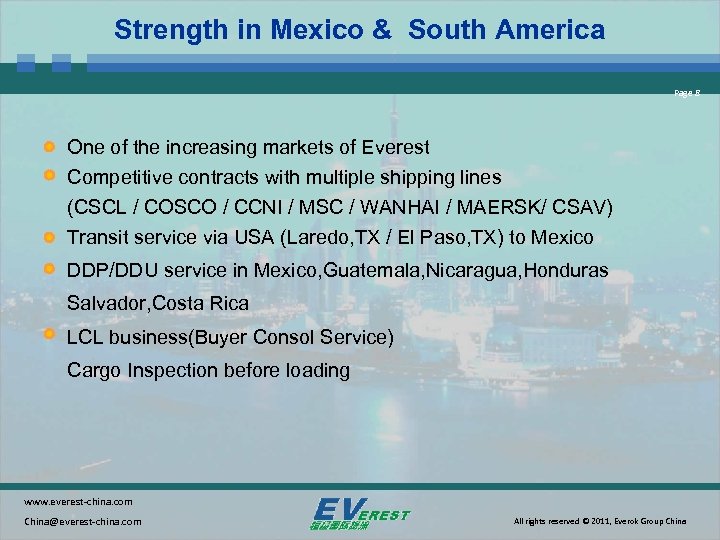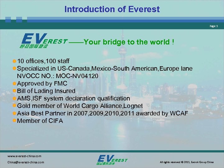 Introduction of Everest Page 3 ——Your bridge to the world ! 10 offices, 100 staff Specialized in US-Canada, Mexico-South American, Europe lane NVOCC NO. : MOC-NV 04120 Approved by FMC Bill of Lading Insured AMS, ISF system declaration qualification Gold member of World Cargo Alliance, Lognet Asia Best Partner in 2007, 2009, 2010, 2011 awarded by WCAF Member of CIFA www. everest-china. com China@everest-china. com All rights reserved © 2011, Everok Group China