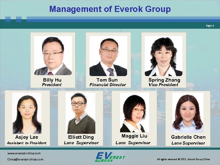 Management of Everok Group Page 4 Billy Hu President Tom Sun Financial Director Asjoy Lee Elliott Ding Assistant to President Lane Supervisor Spring Zhang Vice President Maggie Liu Lane Supervisor Gabrielle Chen Lane Supervisor www. everest-china. com China@everest-china. com All rights reserved © 2011, Everok Group China