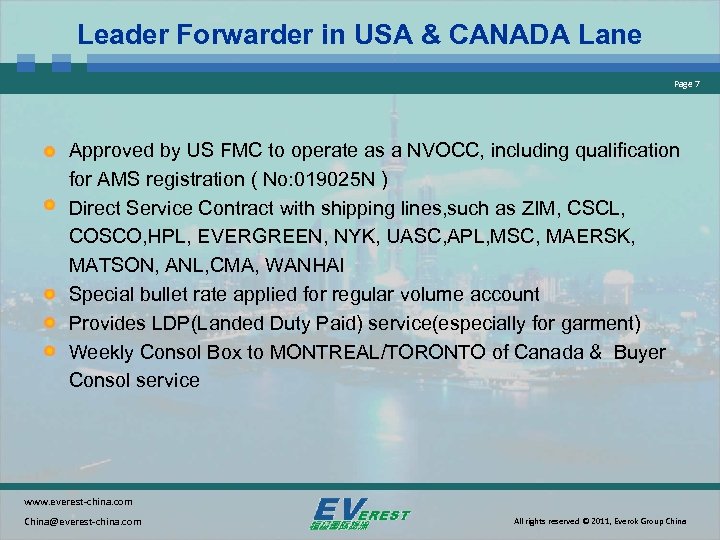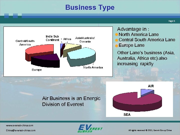 Business Type Page 6 Advantage in : North America Lane Central South America Lane Europe Lane Other Lane’s business (Asia, Australia, Africa etc) also increasing rapidly Air Business is an Energic Division of Everest www. everest-china. com China@everest-china. com All rights reserved © 2011, Everok Group China