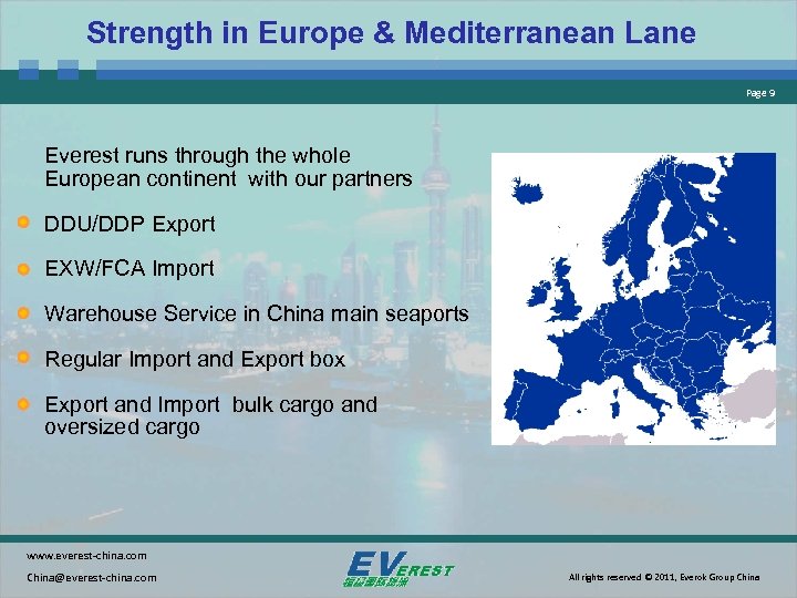 Strength in Europe & Mediterranean Lane Page 9 Everest runs through the whole European continent with our partners DDU/DDP Export EXW/FCA Import Warehouse Service in China main seaports Regular Import and Export box Export and Import bulk cargo and oversized cargo www. everest-china. com China@everest-china. com All rights reserved © 2011, Everok Group China