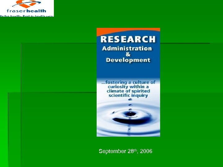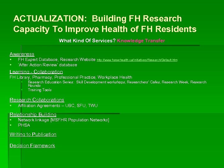 ACTUALIZATION: Building FH Research Capacity To Improve Health of FH Residents What Kind Of Services? Knowledge Transfer Awareness § § FH Expert Database, Research Website http: //www. fraserhealth. ca/Initiatives/Research/Default. htm ‘After Action Review’ database Learning - Collaboration FH Library, Pharmacy, Professional Practice, Workplace Health § § Research Education Series: Skill Development workshops, Researchers’ Cafes, Research Week, Research Rounds Training Tools Research Collaborations § Affiliation Agreements – UBC, SFU, TWU Relationship Building § § Network linkage [MSFHR Population Networks] PHSA Writing to Publication Decision Framework