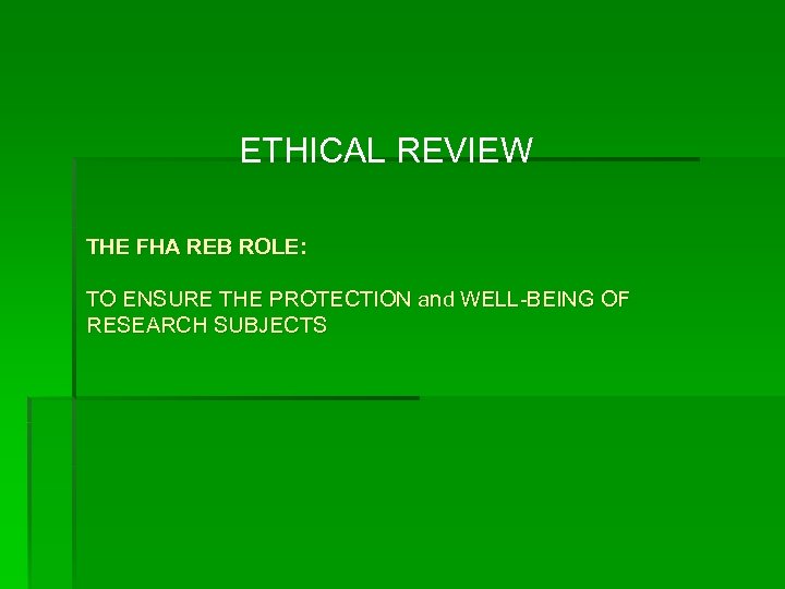 ETHICAL REVIEW THE FHA REB ROLE: TO ENSURE THE PROTECTION and WELL-BEING OF RESEARCH SUBJECTS