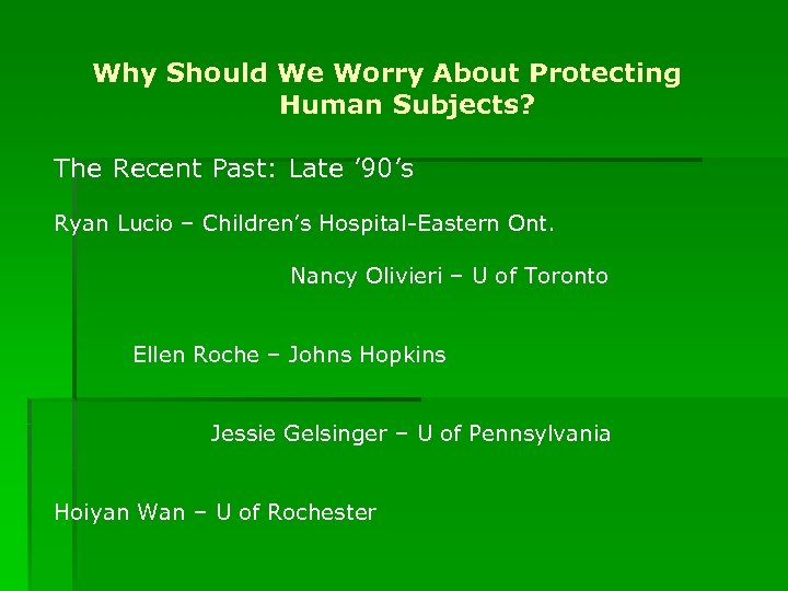 Why Should We Worry About Protecting Human Subjects? The Recent Past: Late ’ 90’s Ryan Lucio – Children’s Hospital-Eastern Ont. Nancy Olivieri – U of Toronto Ellen Roche – Johns Hopkins Jessie Gelsinger – U of Pennsylvania Hoiyan Wan – U of Rochester