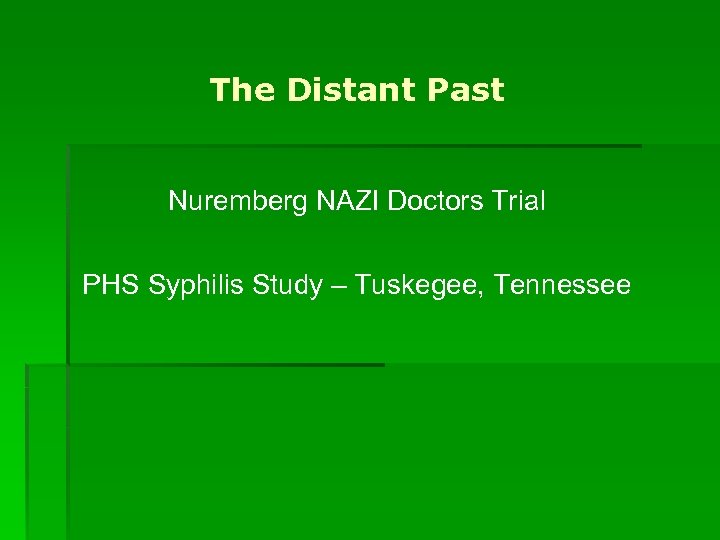 The Distant Past Nuremberg NAZI Doctors Trial PHS Syphilis Study – Tuskegee, Tennessee