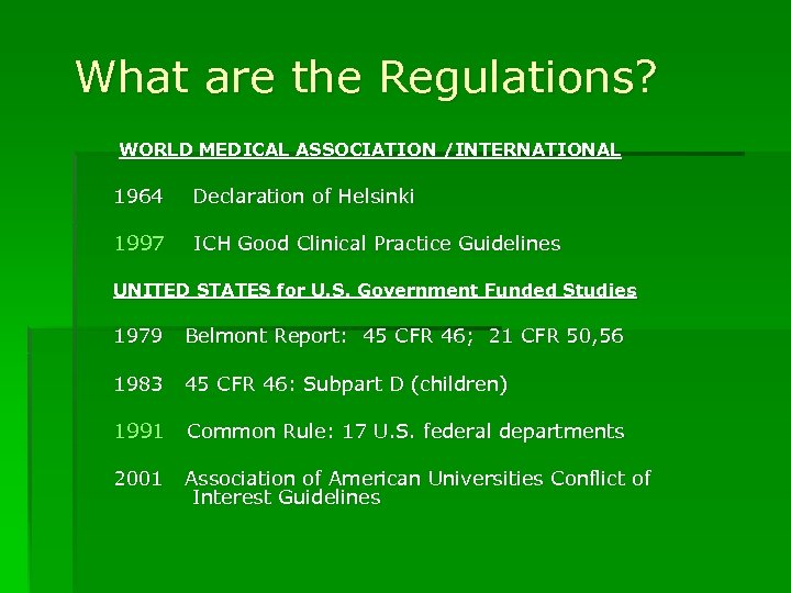 What are the Regulations? WORLD MEDICAL ASSOCIATION /INTERNATIONAL 1964 Declaration of Helsinki 1997 ICH Good Clinical Practice Guidelines UNITED STATES for U. S. Government Funded Studies 1979 Belmont Report: 45 CFR 46; 21 CFR 50, 56 1983 45 CFR 46: Subpart D (children) 1991 Common Rule: 17 U. S. federal departments 2001 Association of American Universities Conflict of Interest Guidelines