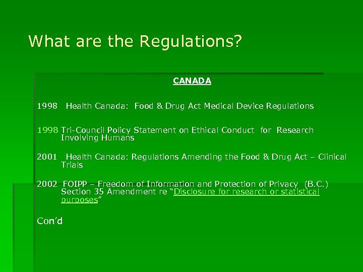 What are the Regulations? CANADA 1998 Health Canada: Food & Drug Act Medical Device Regulations 1998 Tri-Council Policy Statement on Ethical Conduct for Research Involving Humans 2001 Health Canada: Regulations Amending the Food & Drug Act – Clinical Trials 2002 FOIPP – Freedom of Information and Protection of Privacy (B. C. ) Section 35 Amendment re “Disclosure for research or statistical purposes” Con’d
