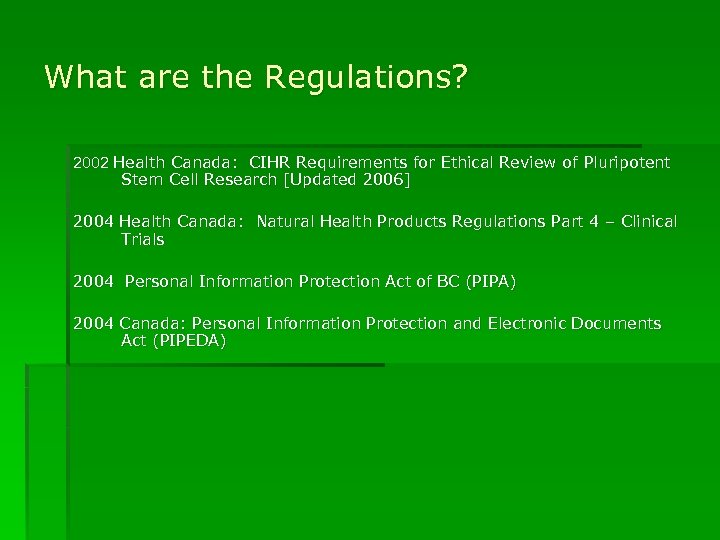 What are the Regulations? 2002 Health Canada: CIHR Requirements for Ethical Review of Pluripotent Stem Cell Research [Updated 2006] 2004 Health Canada: Natural Health Products Regulations Part 4 – Clinical Trials 2004 Personal Information Protection Act of BC (PIPA) 2004 Canada: Personal Information Protection and Electronic Documents Act (PIPEDA)