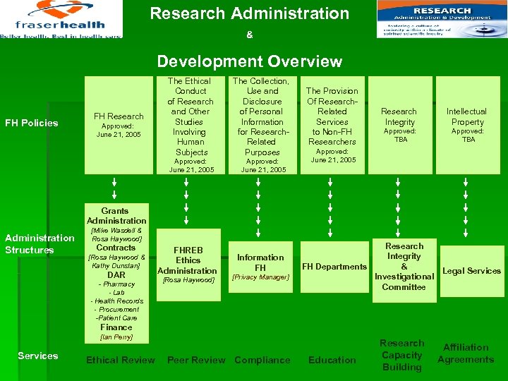 Research Administration & Development Overview FH Policies FH Research Approved: June 21, 2005 The Ethical Conduct of Research and Other Studies Involving Human Subjects Approved: June 21, 2005 The Collection, Use and Disclosure of Personal Information for Research. Related Purposes Approved: June 21, 2005 The Provision Of Research. Related Services to Non-FH Researchers Research Integrity Intellectual Property Approved: TBA Approved: June 21, 2005 Grants Administration Structures [Mike Wasdell & Rosa Haywood] Contracts [Rosa Haywood & Kathy Dunstan] DAR - Pharmacy - Lab - Health Records - Procurement -Patient Care FHREB Ethics Administration [Rosa Haywood] Information FH [Privacy Manager] Research Integrity & FH Departments Investigational Committee Legal Services Finance [Ian Perry] Services Ethical Review Peer Review Compliance Education Research Capacity Building Affiliation Agreements