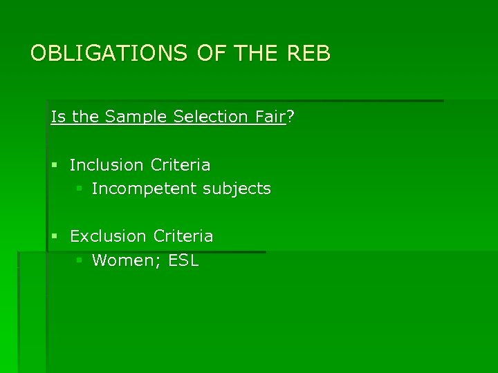 OBLIGATIONS OF THE REB Is the Sample Selection Fair? § Inclusion Criteria § Incompetent subjects § Exclusion Criteria § Women; ESL