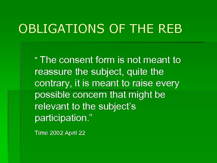 OBLIGATIONS OF THE REB “ The consent form is not meant to reassure the subject, quite the contrary, it is meant to raise every possible concern that might be relevant to the subject’s participation. ” Time 2002 April 22