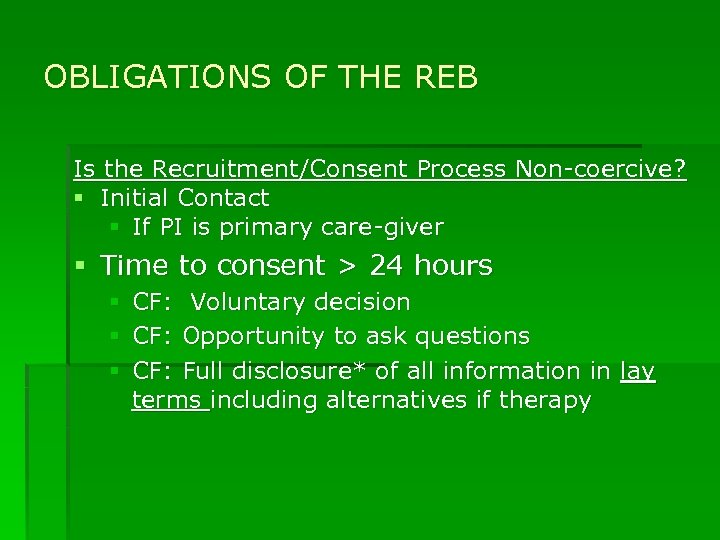 OBLIGATIONS OF THE REB Is the Recruitment/Consent Process Non-coercive? § Initial Contact § If PI is primary care-giver § Time to consent > 24 hours § § § CF: Voluntary decision CF: Opportunity to ask questions CF: Full disclosure* of all information in lay terms including alternatives if therapy