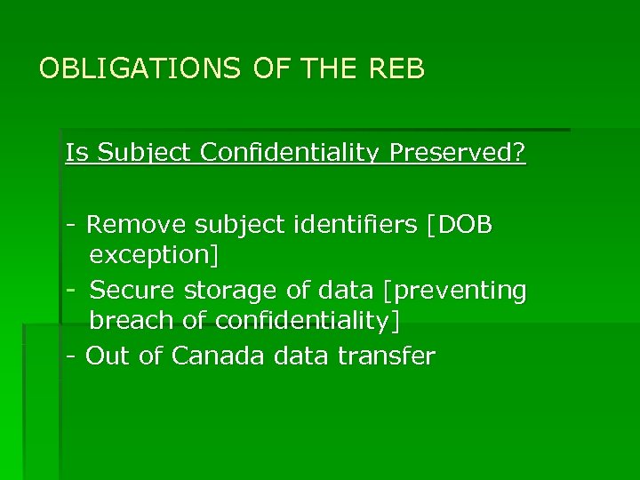 OBLIGATIONS OF THE REB Is Subject Confidentiality Preserved? - Remove subject identifiers [DOB exception] - Secure storage of data [preventing breach of confidentiality] - Out of Canada data transfer