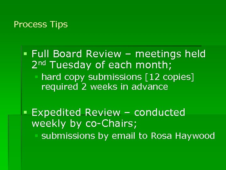 Process Tips § Full Board Review – meetings held 2 nd Tuesday of each month; § hard copy submissions [12 copies] required 2 weeks in advance § Expedited Review – conducted weekly by co-Chairs; § submissions by email to Rosa Haywood