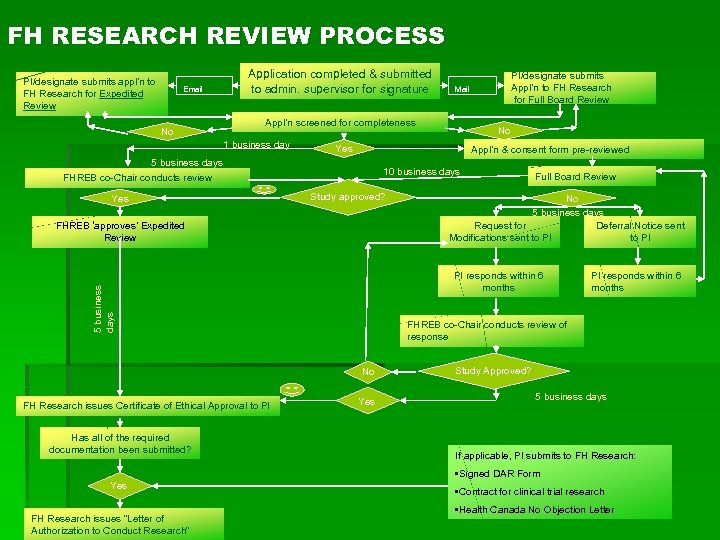 FH RESEARCH REVIEW PROCESS PI/designate submits appl’n to FH Research for Expedited Review Email No Application completed & submitted to admin. supervisor for signature Appl’n & consent form pre-reviewed 10 business days FHREB co-Chair conducts review Yes Study approved? FHREB ‘approves’ Expedited Review Full Board Review No 5 business days Request for Deferral Notice sent Modifications sent to PI 5 business days PI responds within 6 months FHREB co-Chair conducts review of response No FH Research issues Certificate of Ethical Approval to PI No Yes 5 business days Has all of the required documentation been submitted? Mail Appl’n screened for completeness 1 business day PI/designate submits Appl’n to FH Research for Full Board Review Yes Study Approved? 5 business days If applicable, PI submits to FH Research: • Signed DAR Form Yes FH Research issues “Letter of Authorization to Conduct Research” • Contract for clinical trial research • Health Canada No Objection Letter