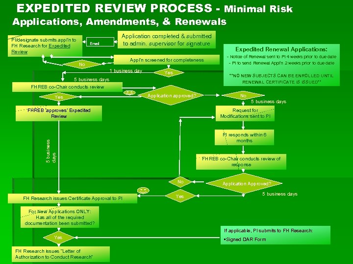 EXPEDITED REVIEW PROCESS - Minimal Risk Applications, Amendments, & Renewals PI/designate submits appl’n to FH Research for Expedited Review Email Application completed & submitted to admin. supervisor for signature Appl’n screened for completeness No 1 business day Yes **NO NEW SUBJECTS CAN BE ENROLLED UNTIL RENEWAL CERTIFICATE IS ISSUED** 5 business days FHREB co-Chair conducts review Yes Application approved? No 5 business days FHREB ‘approves’ Expedited Review Request for Modifications sent to PI 5 business days PI responds within 6 months FHREB co-Chair conducts review of response No FH Research issues Certificate Approval to PI Expedited Renewal Applications: - Notice of Renewal sent to PI 4 weeks prior to due date - PI to send Renewal Appl’n 2 weeks prior to due date Yes Application Approved? 5 business days For New Applications ONLY: Has all of the required documentation been submitted? If applicable, PI submits to FH Research: Yes FH Research issues “Letter of Authorization to Conduct Research” • Signed DAR Form