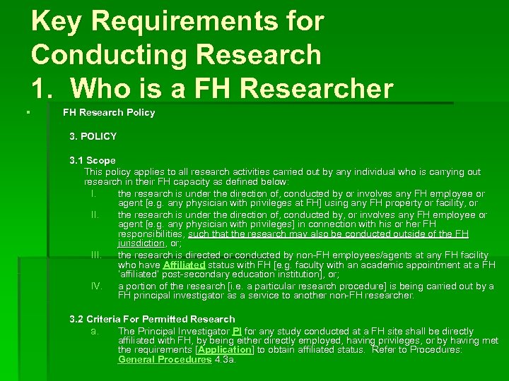 Key Requirements for Conducting Research 1. Who is a FH Researcher § FH Research Policy 3. POLICY 3. 1 Scope This policy applies to all research activities carried out by any individual who is carrying out research in their FH capacity as defined below: I. the research is under the direction of, conducted by or involves any FH employee or agent [e. g. any physician with privileges at FH] using any FH property or facility, or II. the research is under the direction of, conducted by, or involves any FH employee or agent [e. g. any physician with privileges] in connection with his or her FH responsibilities, such that the research may also be conducted outside of the FH jurisdiction, or; III. the research is directed or conducted by non-FH employees/agents at any FH facility who have Affiliated status with FH [e. g. faculty with an academic appointment at a FH ‘affiliated’ post-secondary education institution], or; IV. a portion of the research [i. e. a particular research procedure] is being carried out by a FH principal investigator as a service to another non-FH researcher. 3. 2 Criteria For Permitted Research a. The Principal Investigator PI for any study conducted at a FH site shall be directly affiliated with FH, by being either directly employed, having privileges, or by having met the requirements [Application] to obtain affiliated status. Refer to Procedures: General Procedures 4. 3 a.