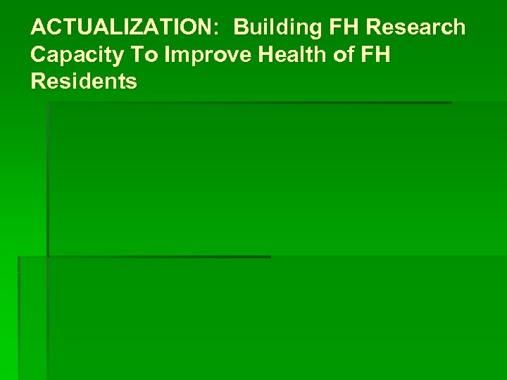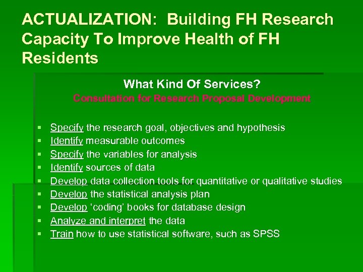 ACTUALIZATION: Building FH Research Capacity To Improve Health of FH Residents What Kind Of Services? Consultation for Research Proposal Development § § § § § Specify the research goal, objectives and hypothesis Identify measurable outcomes Specify the variables for analysis Identify sources of data Develop data collection tools for quantitative or qualitative studies Develop the statistical analysis plan Develop ‘coding’ books for database design Analyze and interpret the data Train how to use statistical software, such as SPSS