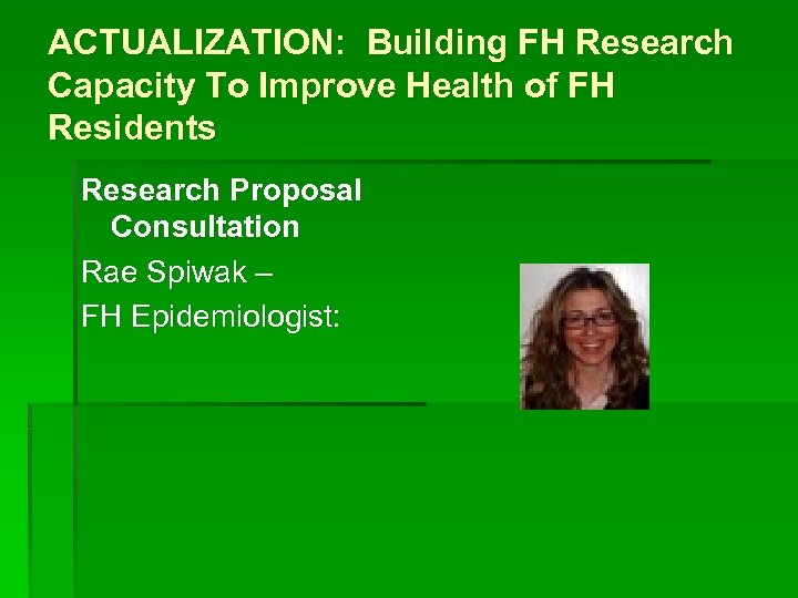 ACTUALIZATION: Building FH Research Capacity To Improve Health of FH Residents Research Proposal Consultation Rae Spiwak – FH Epidemiologist: